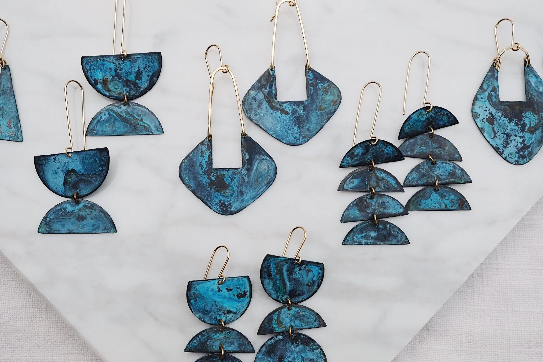 the patina may continue to develop, wear and darken over time even with it’s protective coating. This is the beauty of the natural aging process. To care for them, keep away from water, moisture and beauty products. Wipe gently with soft cloth.